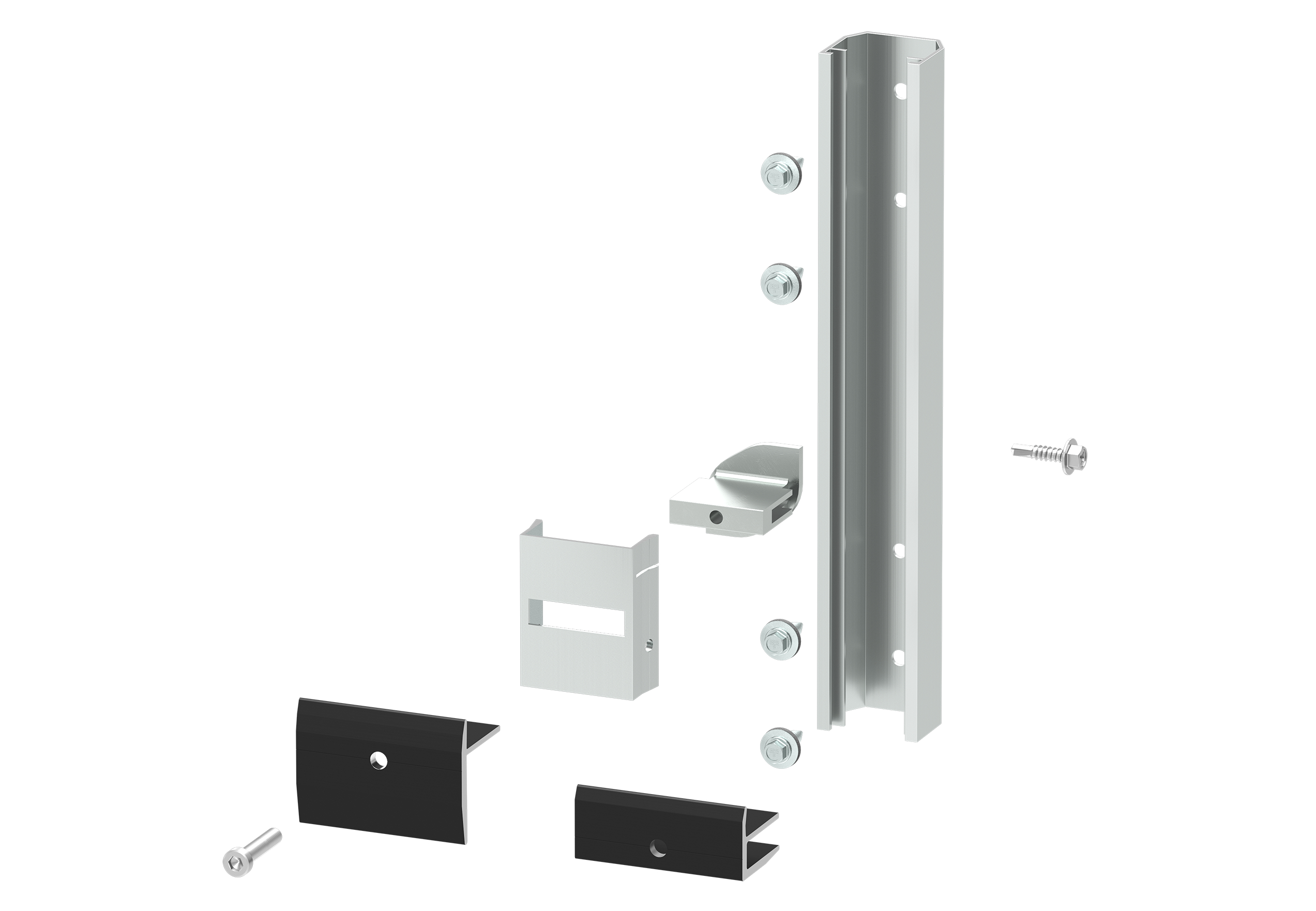 Das Montagesystem basiert auf abgestimmten Einzelkomponenten, die die direkte Befestigung von Photovoltaikmodulen auf geeigneten Fassadenuntergründen ermöglichen. Es ist für den Einsatz auf Trapezblechfassaden sowie auf Betonuntergründen konzipiert und kann auf Anfrage auch bei Sandwichpaneelen eingesetzt werden. Zentrale Elemente sind ein Aluminium-C-Profil mit rückseitiger EPDM-Unterlage, Photovoltaikhalter für Moduldicken von 30 bis 40 Millimetern sowie Mittel- und Endklemmen zur Modulfixierung. Ergänzt wird der Aufbau durch den sogenannten SnapClip, der die Position des Modulhalters auf dem Profil sichert und zugleich Justierungen während der Montage ermöglicht. Durch diese systematische Abstimmung entsteht ein klar strukturierter Aufbau mit wenigen Bauteilen und nachvollziehbaren Montageschritten.