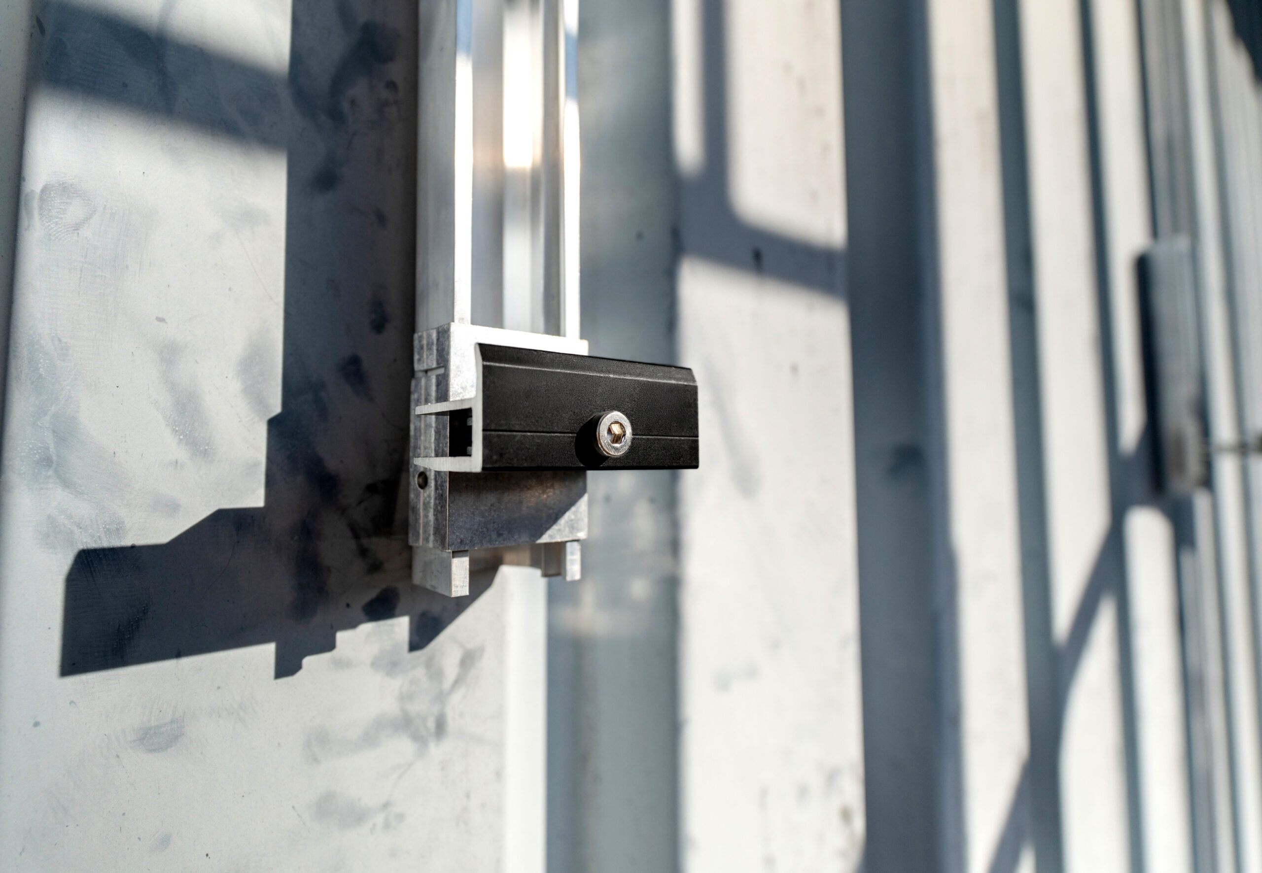 Für die Montage wird das Photovoltaikmodul zunächst in der unteren Klemme positioniert, wodurch der Zugang zu den rückseitigen Kabelanschlüssen erhalten bleibt. Anschließend wird die obere Modulkante eingesetzt und das Modul kontrolliert in seine endgültige Position abgesenkt. Das Montageprinzip erlaubt eine schrittweise Ausrichtung der Module, ohne benachbarte Elemente demontieren zu müssen, etwa bei durchlaufenden Modulreihen an Fassadenflächen. Dadurch lassen sich auch bei größeren Fassadenflächen gleichmäßige Modulbilder realisieren. Zur Feinjustierung stehen Ausgleichs- und Feineinstellplatten zur Verfügung, mit denen Höhenabweichungen bis zu zwei Millimetern direkt im System ausgeglichen werden können. Größere Toleranzen lassen sich über eine Anpassung der unteren Modulauflage korrigieren, ohne angrenzende Module entfernen zu müssen. Nach dem Ausrichten werden die Module über einen frontseitig zugänglichen Klemmbefestiger mit definiertem Anziehdrehmoment fixiert, wodurch die endgültige Position dauerhaft gesichert wird.