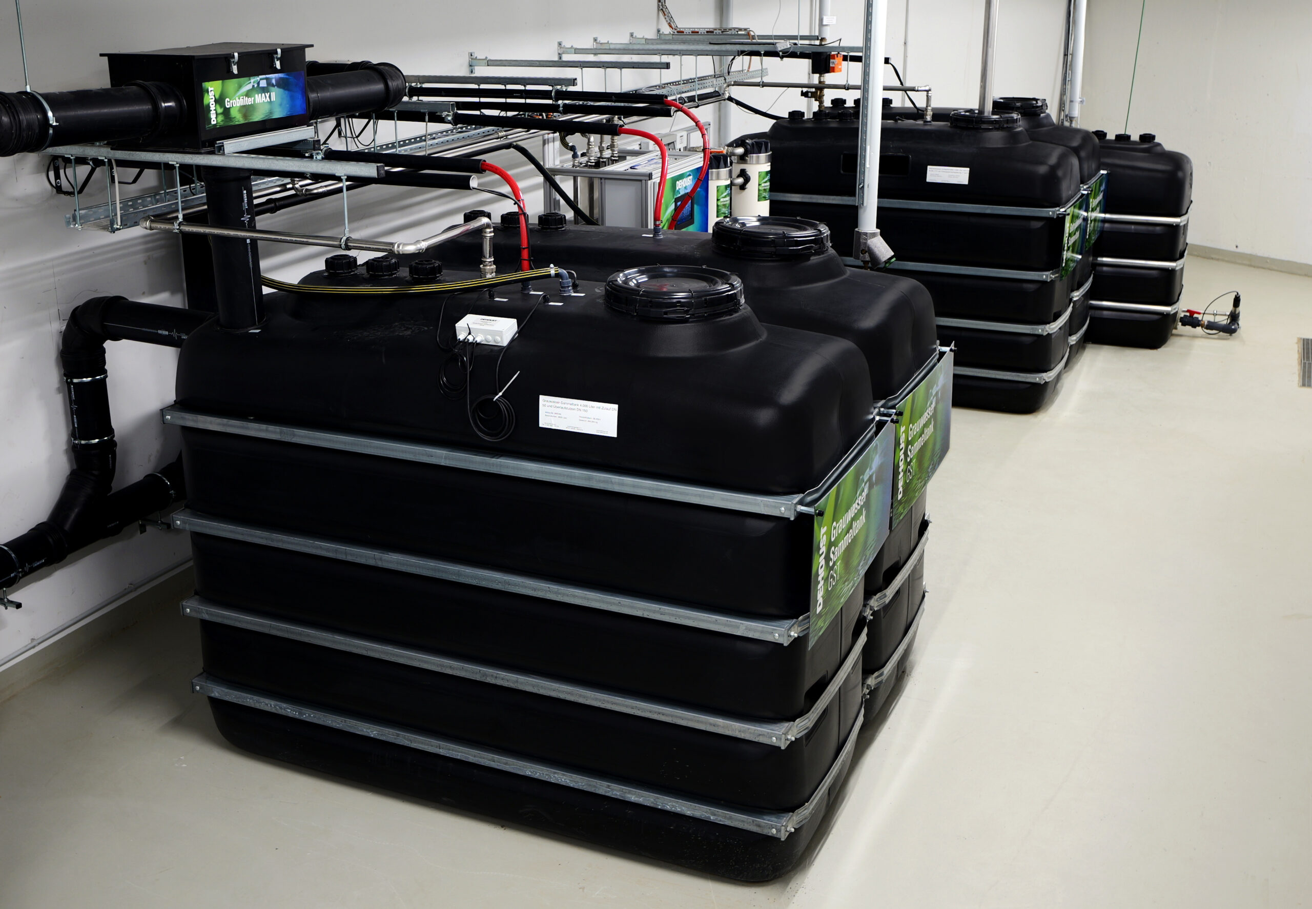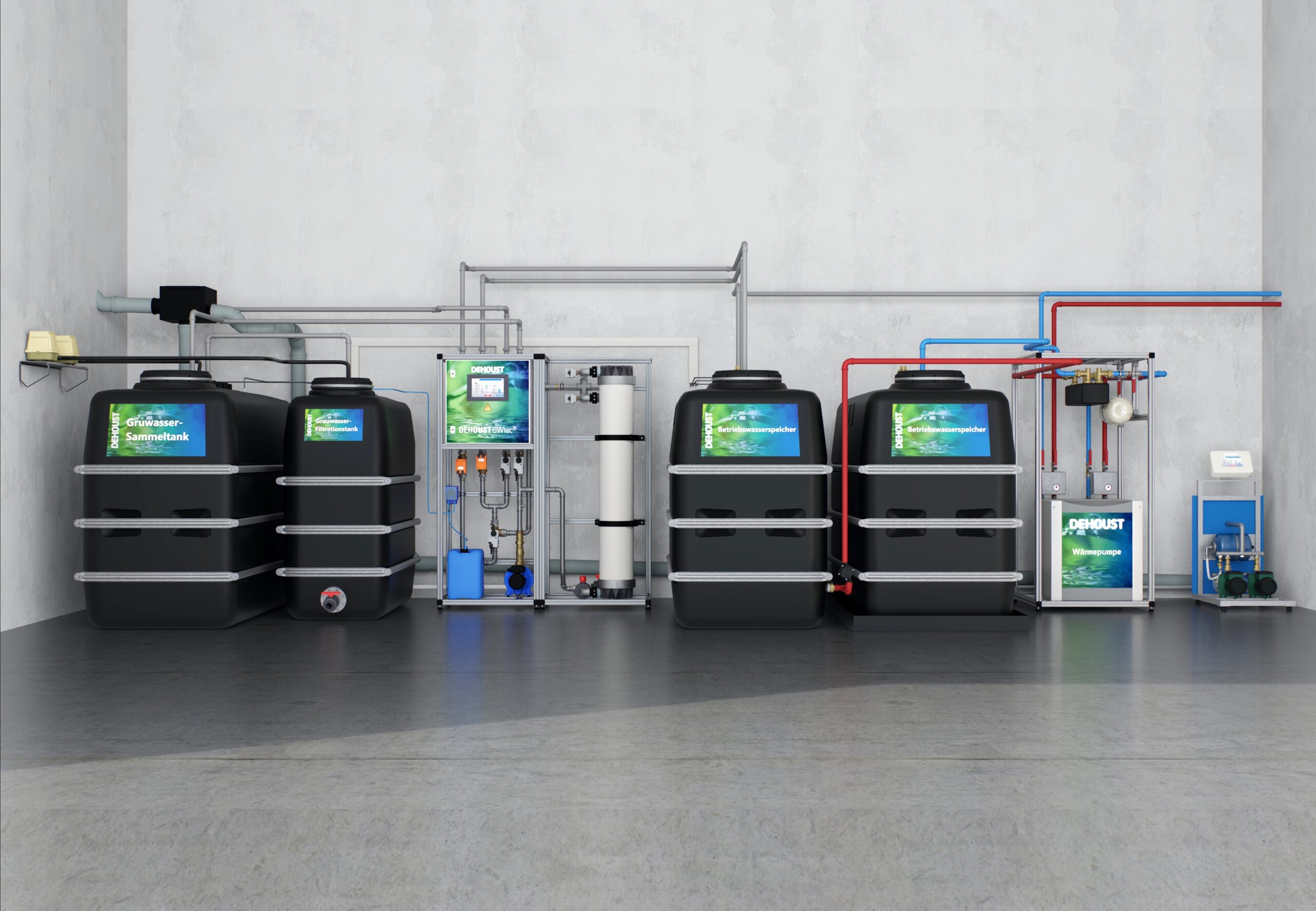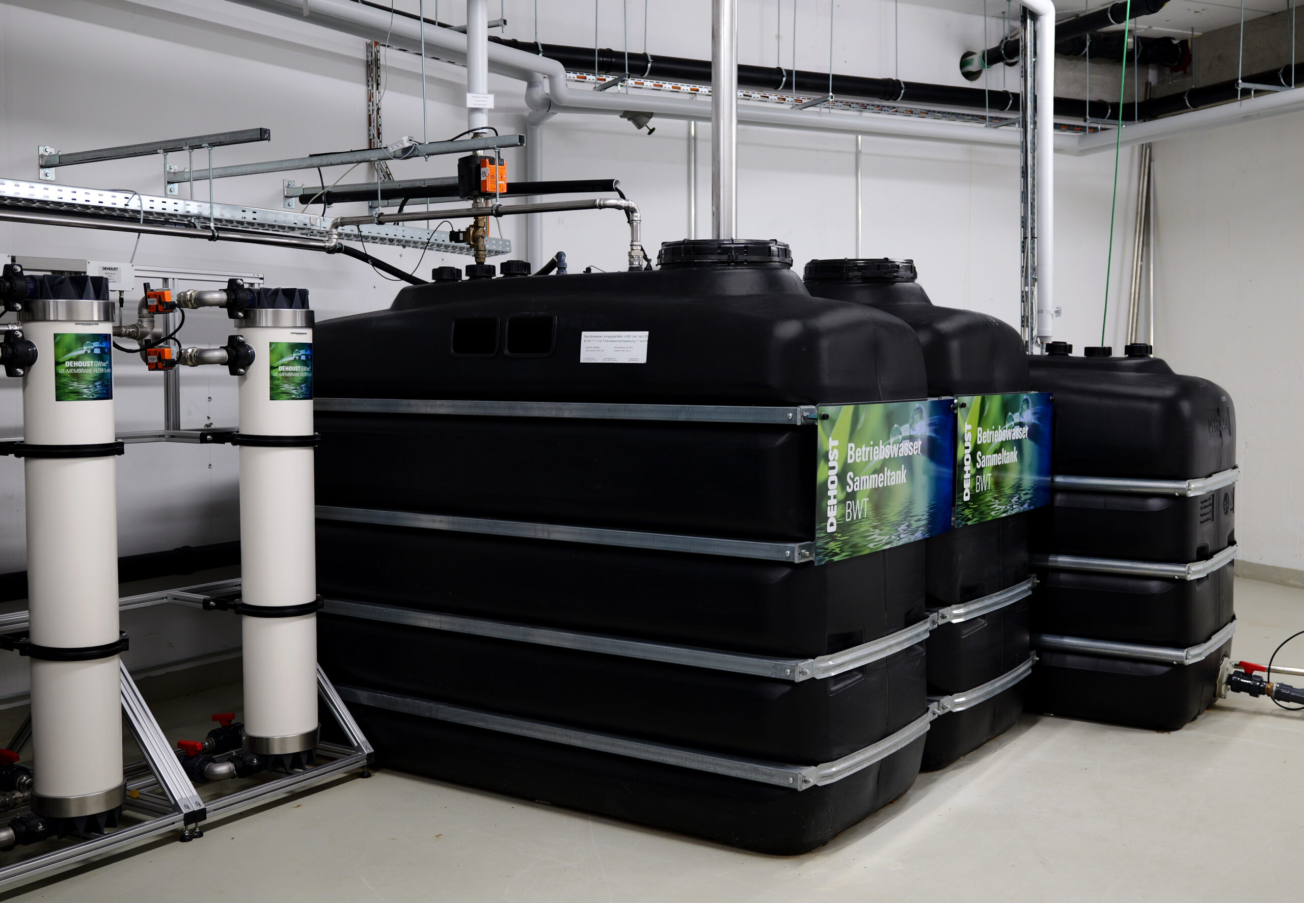Im Wohnquartier ist die GWtec 340 von Dehoust im Einsatz. Die Grauwasseranlage eignet sich zur umweltfreundlichen und energieeffizienten Aufbereitung von Grauwasser aus Duschen, Handwaschbecken und Badewannen. Mittels Membrantechnologie bereitet die Anlage dieses Grauwasser chemikalienfrei zu Betriebswasser auf. Teilchen mit einer physikalischen Porenbreite von 20 Nanometern wie Partikel, Keime oder absorbierte Viren werden durch die Membran sicher zurückgehalten. Im ersten Schritt erfolgt bereits eine Grobfiltration. Hier werden ungelöste Stoffe wie Haare oder Textilflusen entfernt. Organische Schmutzstoffe wie Seife werden durch Abwasserbakterien aerobisch-biologisch abgebaut. Das im Anschluss an die Ultrafiltration gewonnene Betriebswasser ist klar, geruchlos und keimfrei, zudem ist es langfristig speicherbar. Das Tankvolumen für die Grauwassersammelbehälter sowie die Betriebswasservorlagebehälter beträgt jeweils 8,000 Liter und ist in Bezug auf den täglichen Grauwasserertrag und Betriebswasserbedarf optimal abgestimmt. Die Anlage läuft mit einer Aufbereitungsleistung von 15.000 Litern pro Tag und ermöglicht Anwohnerinnen und Anwohnern eine stetige Nutzung des Betriebswassers für Toilettenspülungen oder zum Wäschewaschen. Wenn kein Betriebswasser im Tank ist, erfolgt eine Trinkwassernachspeisung über die integrierte Trinkwassertrennstation nach EN 1717. Die Anlage arbeitet mit einem niedrigen Energieverbrauch von 0,3 bis 0,5 Kilowattstunden pro Kubikmeter behandeltem Grauwasser.