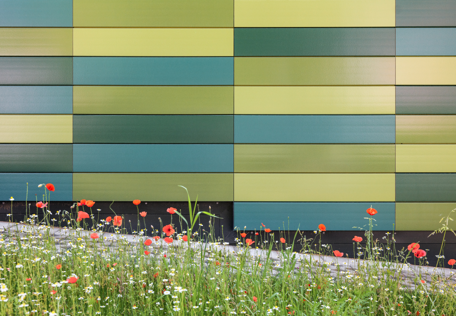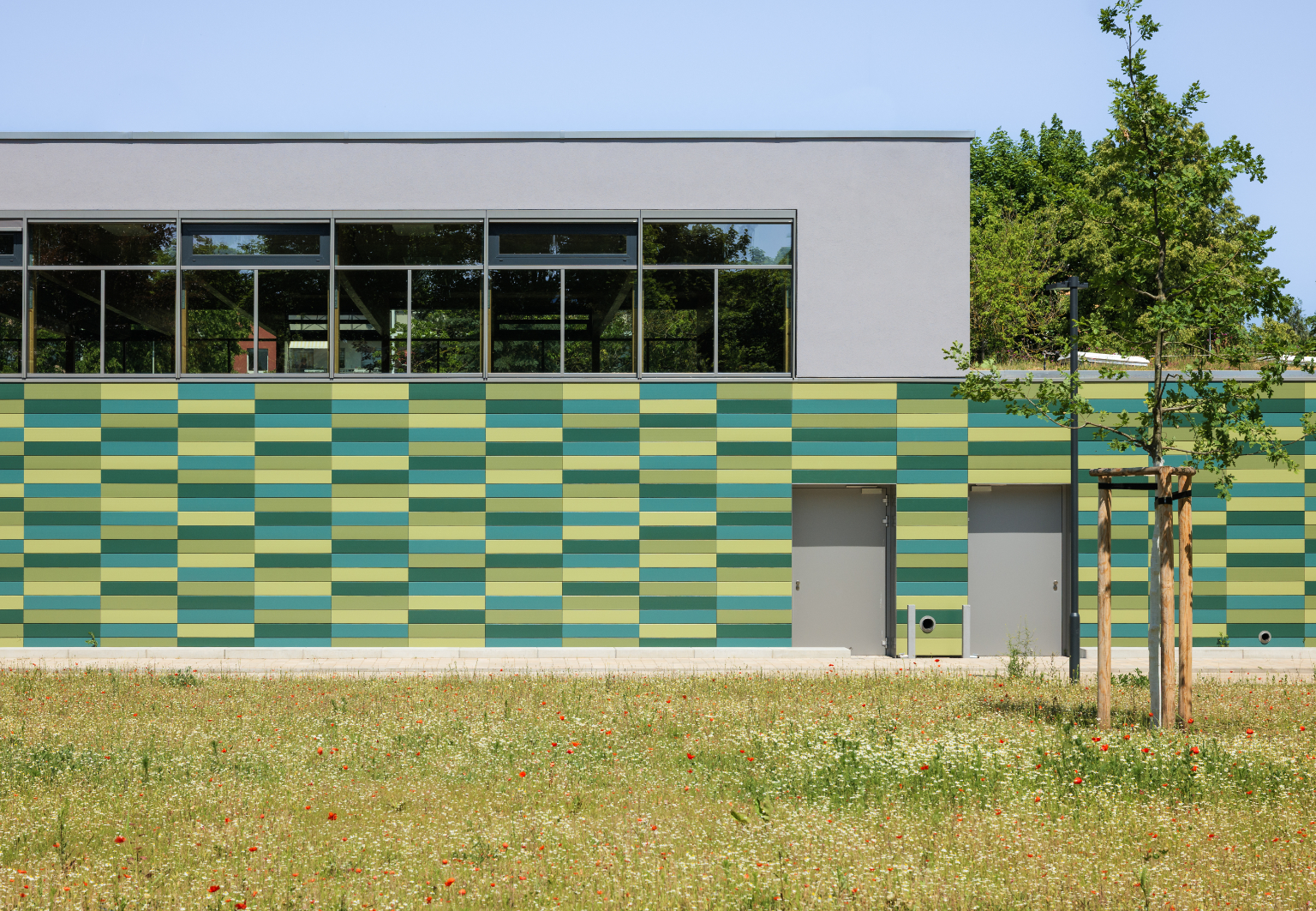 Die Architekten wünschten sich für dieses besondere Projekt eine naturnahe Farbigkeit. Die Auswahl der Nuancen erfolgte zügig, da die Planer bereits in dem umfassenden Tonality-Hauptkatalog ihre Favoriten entdeckten. Es lässt sich jedoch auch jeder andere Farbton auf individuellen Wunsch realisieren. Möglich sind dabei Farbentwicklungen nach NCS in verschiedenen Glanzgraden von matt bis hochglänzend. Bereits über 50 verschiedene grüne Farbapplikationen hat Tonality bereits realisiert. Die Wahl fiel in Dresden auf vier verschiedene Grüntöne mit glatter, matter Oberfläche. Herausforderung bei der Verlegung: Das vom Architekten vorher exakt definierte Farbraster musste eins zu eins umgesetzt werden. Die horizontalen Linien der Keramik schaffen Ruhe, Struktur und eine angenehme Maßstäblichkeit – besonders im Kontext des kindgerechten Bauens. Sie wurden in unterschiedlichen Farbabständen angeordnet, was der Fassade eine lebendige Optik verleiht. Wäre die Farbanordnung einem immer gleichen Ablauf gefolgt, hätte die Gefahr eines monotonen Erscheinungsbilds bestanden. Die Tonality-Fassade bringt mit ihrer naturnahen Farbgestaltung nicht nur Lebendigkeit ins Quartier, sondern stärkt auch das nachhaltige Schulkonzept. Sie erleichtert die Orientierung, stärkt die Identifikation am Standort und macht die Sporthalle im Quartier gut erkennbar. Die unterschiedlichen Farbtöne und die farbenfrohe Gestaltung machen Vielfalt sichtbar – ein visuelles Zeichen für Offenheit, Inklusion und Gemeinschaft.