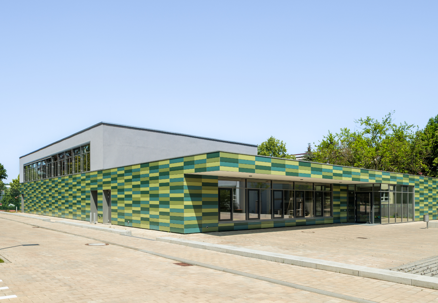 Dank der Tonality-Keramikfassade setzt die neue Sporthalle der Albert-Schweitzer-Schule in Dresden ein architektonisches Zeichen für kindgerechtes nachhaltiges Bauen. Die horizontal angeordneten Keramikelemente greifen natürliche Grüntöne auf und erzeugen eine einladende, lernfördernde Umgebung für Kinder und Jugendliche mit besonderem Förderbedarf. Gleichzeitig erfüllt die Fassade alle Anforderungen an den modernen Schulbau: Sie ist wartungsfrei, ballwurfsicher, widerstandsfähig gegen Vandalismus und dauerhaft gepflegt dank integriertem Graffitischutz. Die Montage der vorgehängten hinterlüfteten Fassade erfolgte zeitsparend mit nur zwei Haltepunkten – ganz ohne die sonst übliche Raster-Unterkonstruktion. Das Projekt zeigt, wie sich architektonischer Anspruch mit kommunalem Nutzwert verbinden lässt.