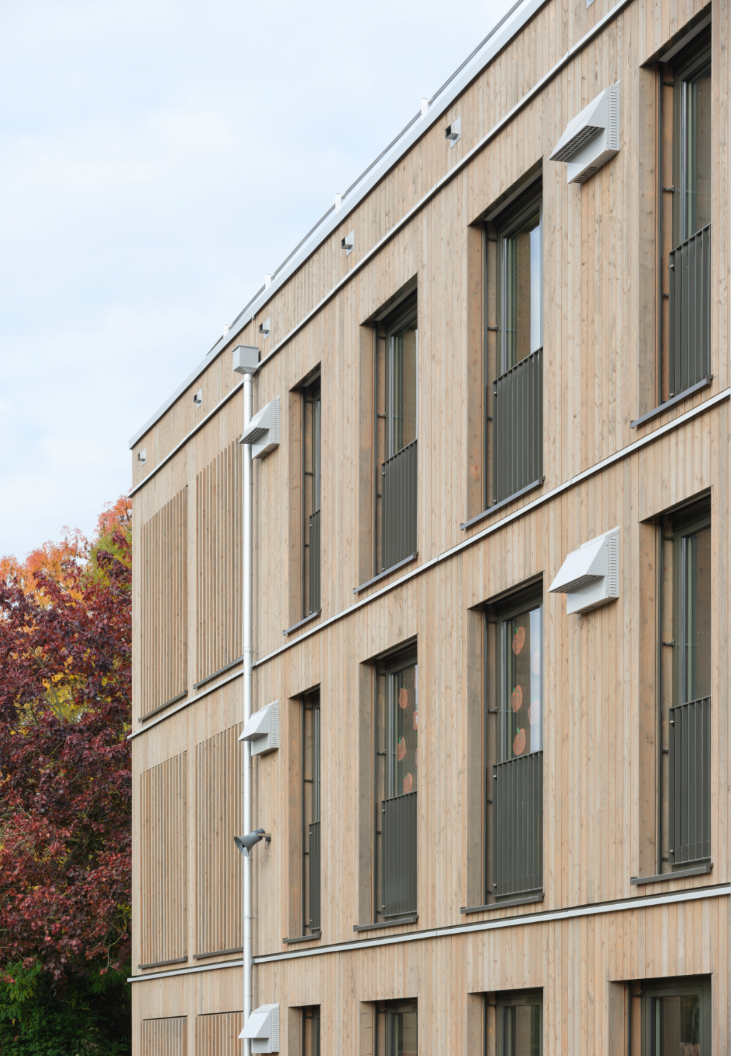 Das gesamte Gebäude besteht aus 80 vorgefertigten Holzmodulen, die beim Holzbauunternehmen Baumgarten GmbH im Raum Fulda produziert und anschließend nach Bensheim transportiert wurden. Für die Module kam unter anderem Kerto LVL von Metsä Wood zum Einsatz. Durch die industrielle Vorfertigung konnte die Montagezeit auf der Baustelle auf ein Minimum reduziert werden. Der laufende Schulbetrieb wurde dadurch kaum beeinträchtigt und auch die Belastung für Anwohner und Umwelt blieb gering. Die Module fügen sich zu einem harmonischen, architektonisch hochwertigen Ensemble zusammen, dessen vertikale Holzschalung dem Gebäude eine natürliche und warme Ausstrahlung verleiht. Auch das Energiekonzept der neuen Schule ist auf Zukunftsfähigkeit ausgelegt: Für ein gesundes Raumklima sorgen dezentrale Komfortlüftungen mit Wärmerückgewinnung und integrierter Luft-Wärmepumpe. Eine großflächige Photovoltaikanlage auf dem Dach wird einen erheblichen Teil des Energiebedarfs decken und so die Umweltbilanz weiter verbessern.