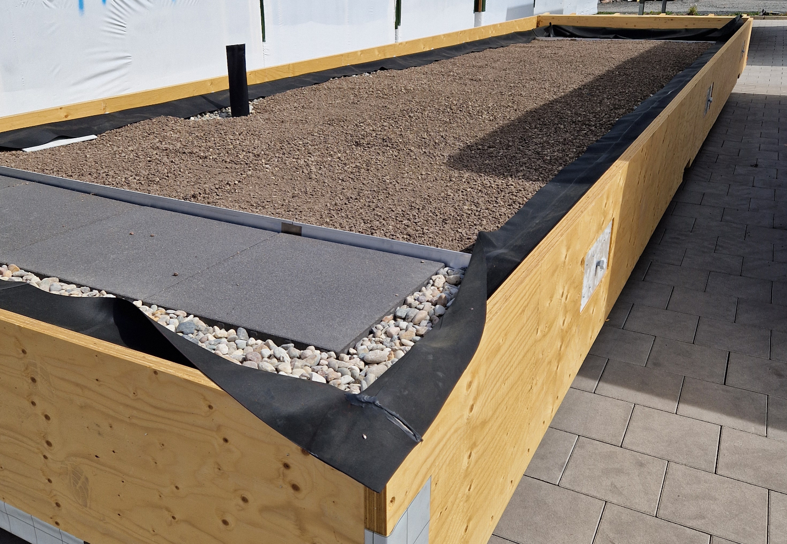 Ein zentrales Element des modularen Baukonzepts in Bensheim ist der Einsatz von Kerto LVL. Im Dachbereich wurde Kerto S verbaut, ein besonders leistungsfähiges Furnierschichtholz, dessen parallel verleimte Furniere für eine außergewöhnlich hohe Biege- und Zugfestigkeit sorgen. Dadurch ist Kerto S prädestiniert für tragende Konstruktionen wie Dachträger und ermöglicht große Spannweiten sowie flexible, offene Grundrisse – ein klarer Vorteil für den modularen Schulbau. Kerto S ist zudem äußerst formstabil. Die exakten Querschnitte und Längen lassen sich im Werk millimetergenau vorfertigen, was eine schnelle und fehlerfreie Montage sicherstellt. Auch die Durchführung von Leitungen oder die Befestigung von Dachaufbauten wird erleichtert. Kerto S zeigt seine besonderen Stärken, wenn es in schlanken, hohen Querschnitten eingesetzt wird – etwa in Dimensionen wie 45 mal 300 oder 57 mal 400 Millimeter. Selbst bei sehr schlanken und hohen Sparren bleibt Kerto S absolut gerade und verzieht sich nicht. Dies ist ein entscheidender Vorteil für präzises, ästhetisch anspruchsvolles Bauen.