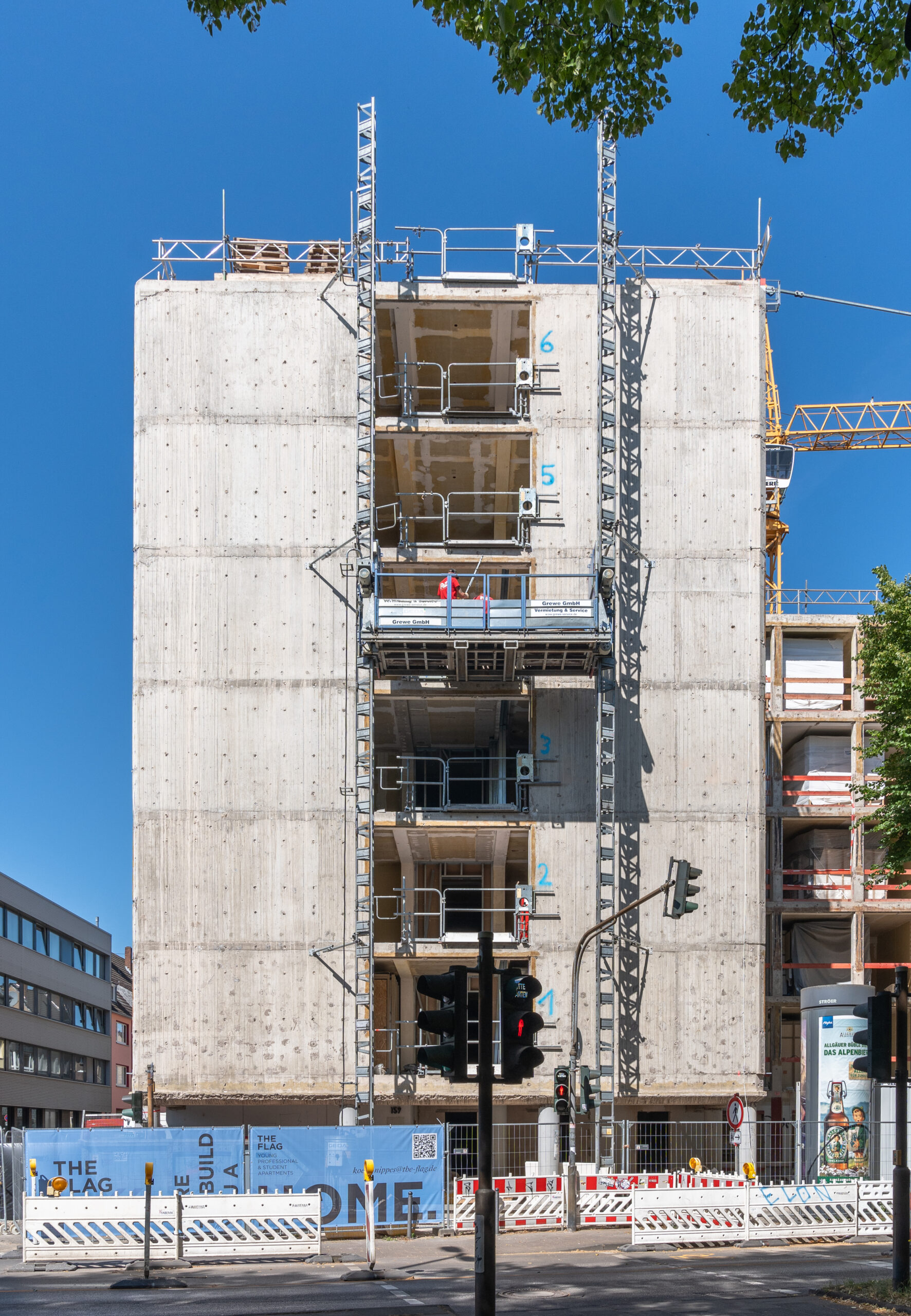 Die urbane Lage stellte besondere Anforderungen an die Logistik. Aufgrund begrenzter Lagerflächen auf der Baustelle erfolgte die Anlieferung der Bauteile „just in time“. Ein durchdachtes Montagekonzept sorgte für einen reibungslosen Bauablauf. Die Montage der Wandelemente erfolgte mit bereits eingesetzten Fenstern, um sofort eine regendichte Fassade zu gewährleisten. Ein Kran im Innenhof ermöglichte die vertikale und horizontale Verladung der Bauteile. Zudem kam eine funkgesteuerte Traverse zum Einsatz, die eine millimetergenaue Positionierung der Elemente ermöglicht.