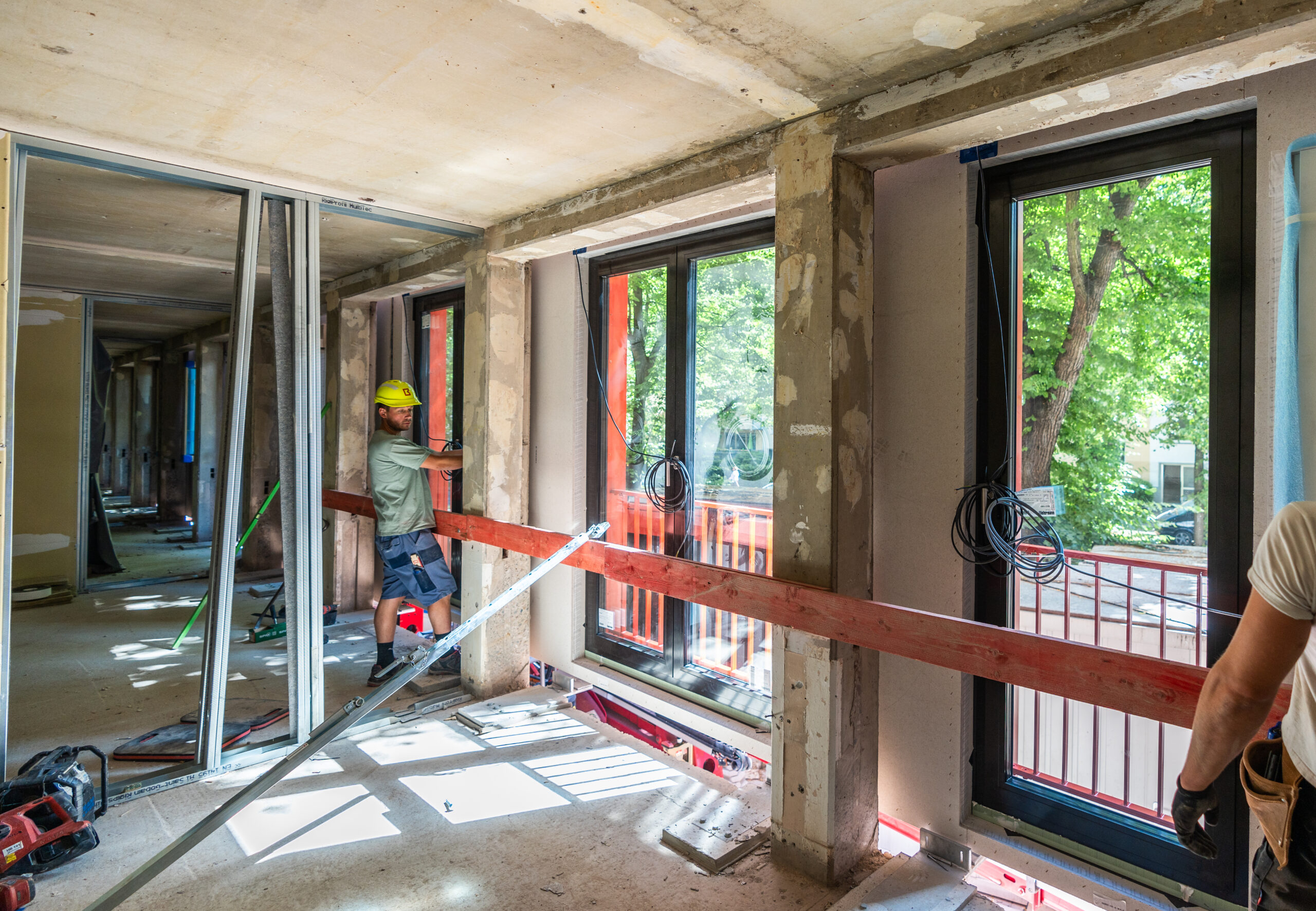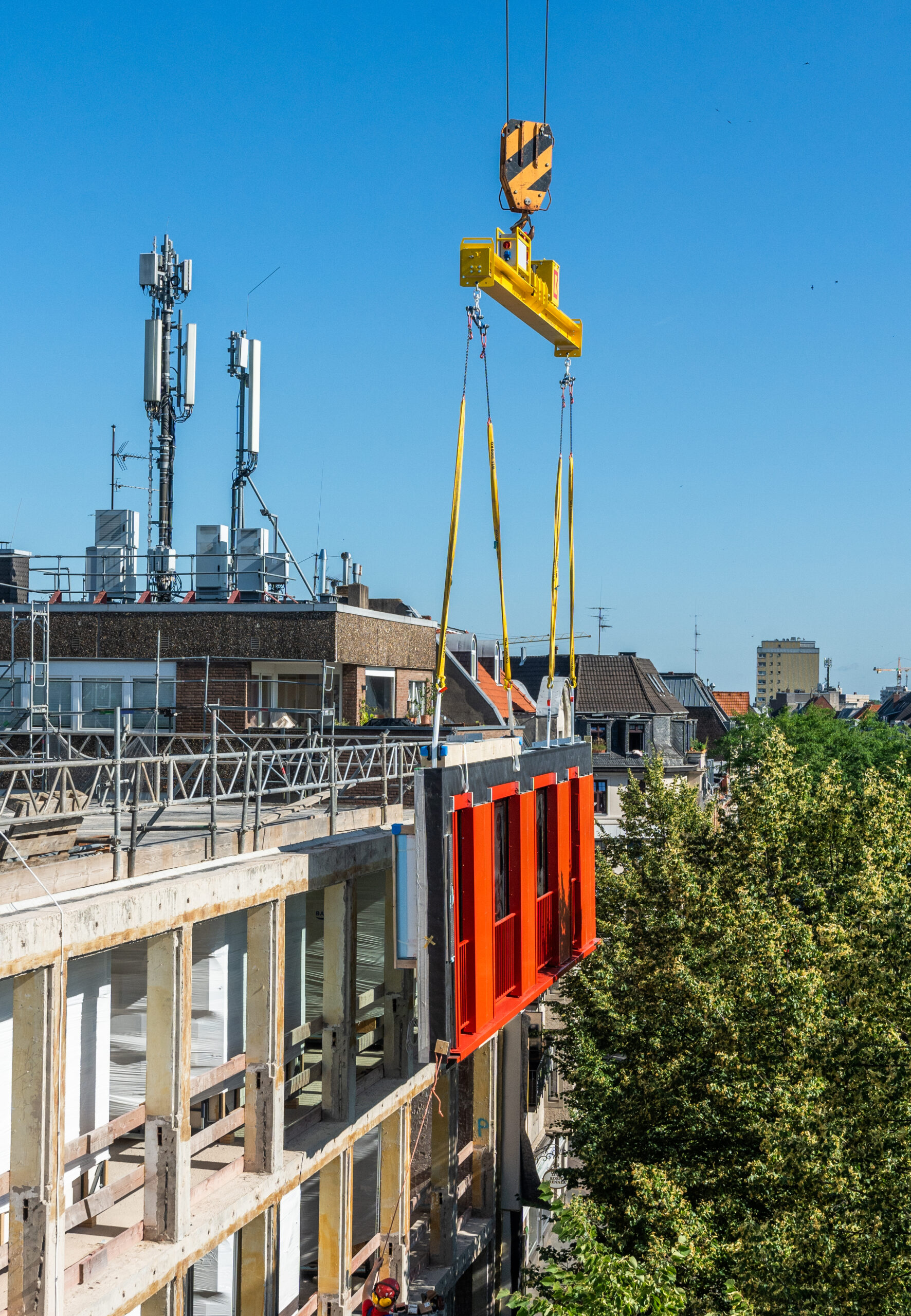 Die Transformation des Bürogebäudes in ein Wohnhaus brachte einige Herausforderungen mit sich. Insbesondere die fein gegliederte Aufteilung der Apartments erforderte umfangreiche Durchbrüche und Anpassungen an der bestehenden Tragstruktur. Die Integration neuer Leitungsführungen für die technische Gebäudeausrüstung (TGA) wurde durch den Einsatz vorgefertigter Module erleichtert.