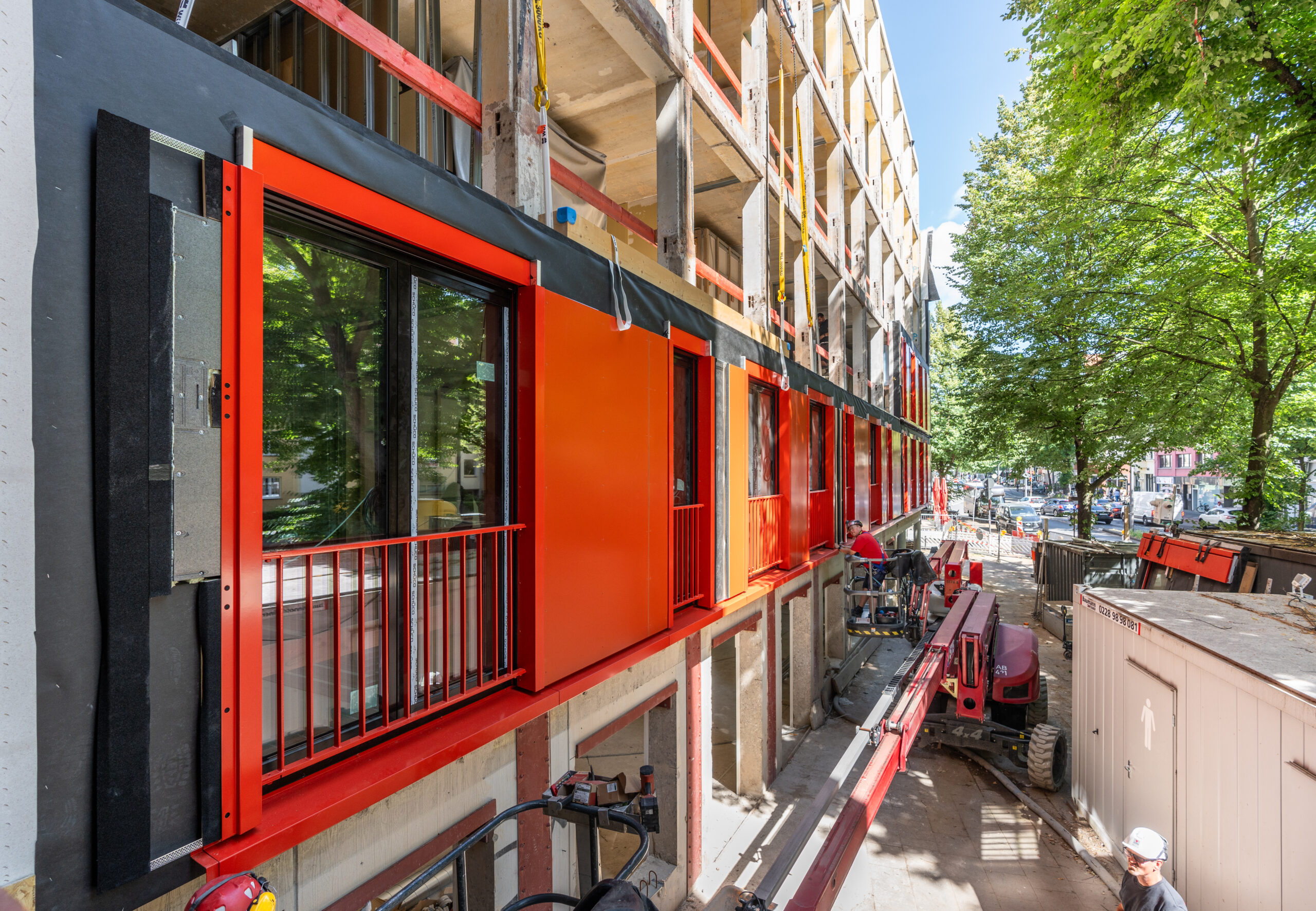 Ein zentraler Aspekt des Projekts war der hohe Vorfertigungsgrad der Bauelemente. Die Holzrahmenbauelemente wurden alle vorproduziert – inklusive Fenster, Dämmung und Fassadenverkleidung. Diese Vorgehensweise minimierte die Bauzeit vor Ort und reduzierte die Belastung durch Baustellenverkehr in der dicht bebauten Innenstadtlage. Auch ermöglicht die Vorfertigung der Bauelemente eine wetterunabhängige Produktion und reduziert Abfälle auf der Baustelle.