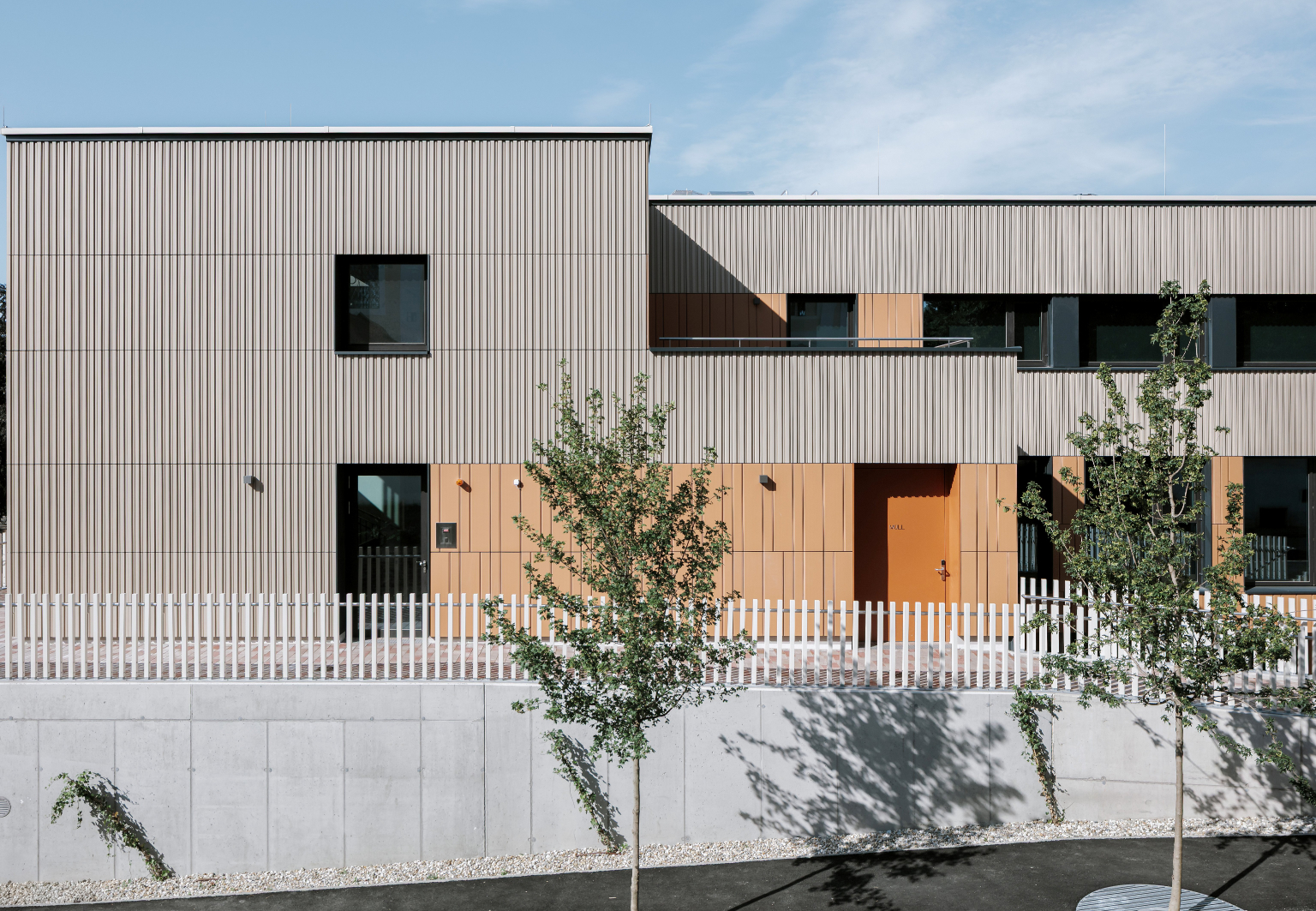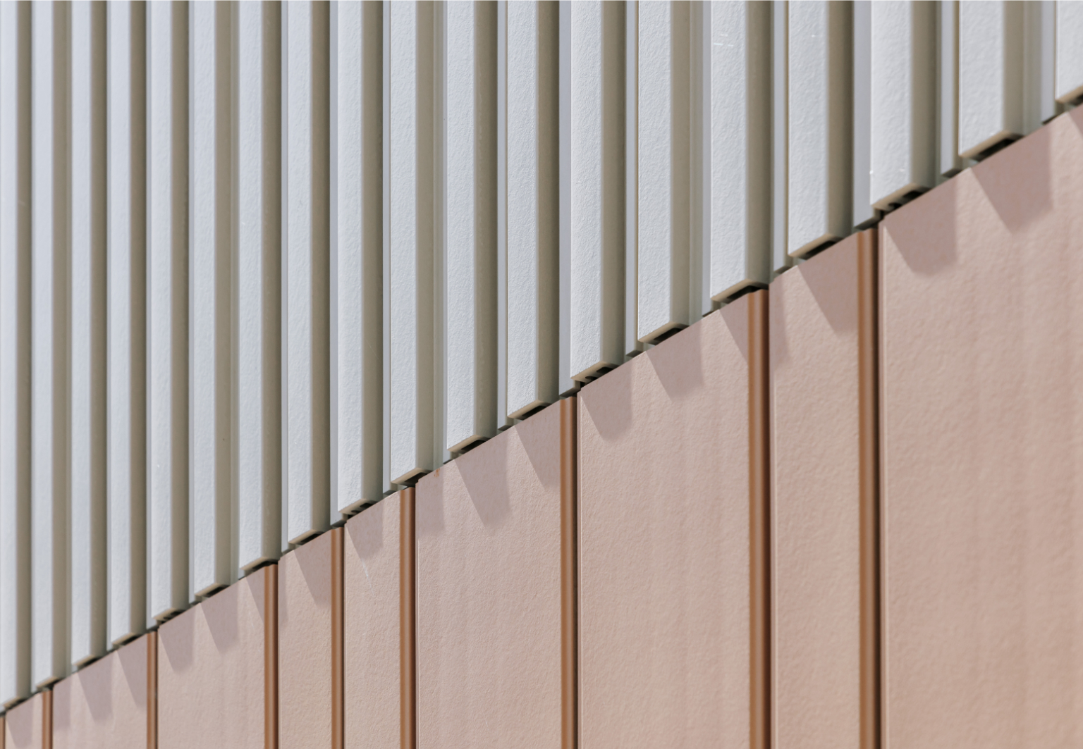 Die Tonality-Keramikfassade verleiht dem Quartier sein markantes Erscheinungsbild. Diese ist nicht nur gestalterisches Highlight, sondern Ausdruck eines konsequent nachhaltigen Bauansatzes. Mit insgesamt 625 Quadratmetern Fassadenfläche gliedert sie das Gebäude in zwei optisch voneinander abgesetzte Bereiche. Der untere Teil im Farbton „Toscana“ ist glatt ausgeführt, mit ungleichmäßigen Vertikalfugen, die sowohl durch den Übergang von einem Element zum nächsten als auch durch bewusst integrierte Scheinfugen entstehen. Der obere Teil der Fassade im Farbton „Creme hell“ zeigt ein eigens entwickeltes Relief mit angestuften, zwischen 50 und 15 Millimeter breiten Stegen. Die 50-Millimeter-Stege bilden die markante, vordergründige Fassadenstruktur und ragen weiter nach vorne heraus. Die schmaleren 15-Millimeter-Stege sind im Vergleich dazu nach hinten versetzt und treten optisch in den Hintergrund. Je nach Tageszeit ändert sich das Fassadenbild subtil und zeigt die gestalterische Tiefe keramischer Oberflächen. Die Keramikelemente passen sich zudem mit ihrer natürlichen Farbigkeit und angenehmen Haptik störungsfrei an die benachbarte Pfarrkirche an